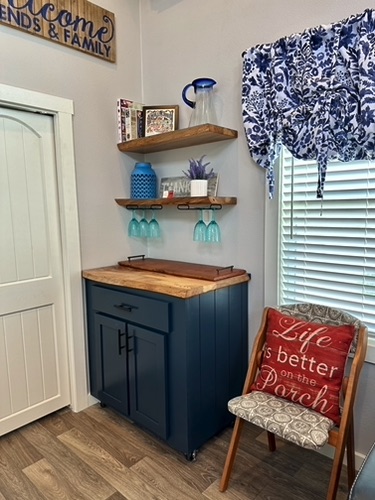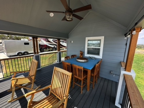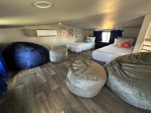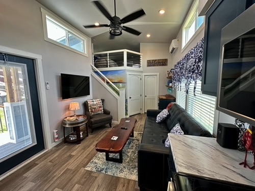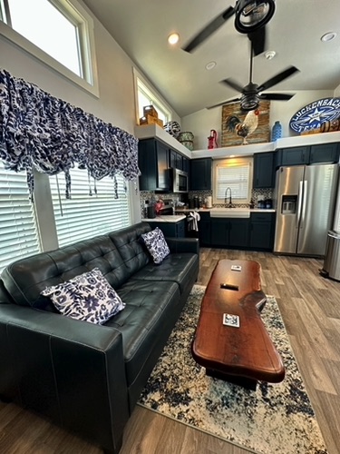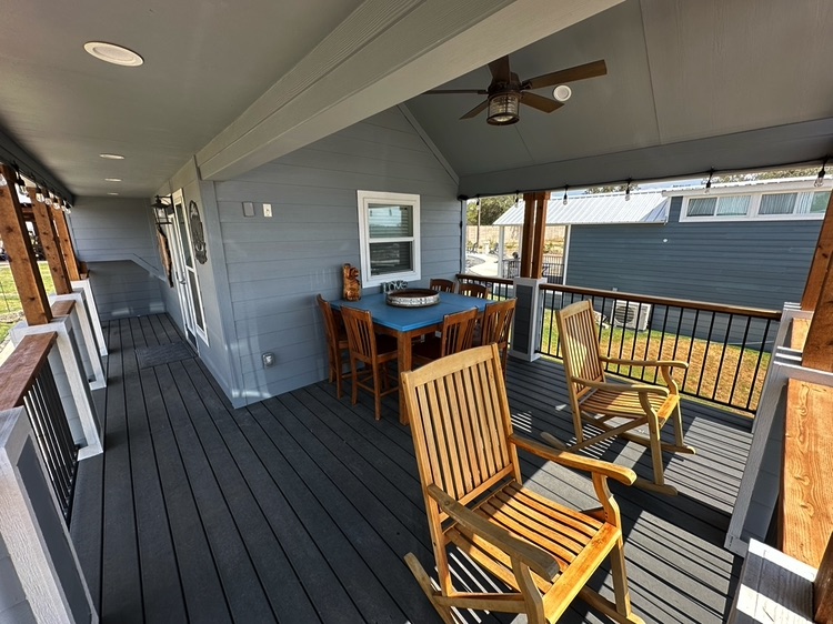 Our Tiny Home is a fully furnished home that sleeps 6 (Queen in master, 2 twins in the loft, and a full size sleeper sofa). Large front porch with table seating for 6 and rocking chairs to enjoy the view of the resort. Walk down the sidewalk that leads to back yard where you will find a large, private concrete patio with a polywood table with seating for 8 people. There is a locally made high top bar table, 2 chaise lounge chairs, and a 3-in-1 grill (smoker, charcoal, and propane options). Enjoy the unobstructed view from the hill top looking straight towards the rear of the property where you can see for miles. There is also a wood burning fire pit with comfortable polywood seating all around.