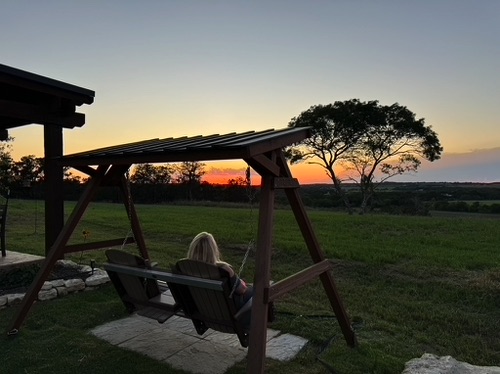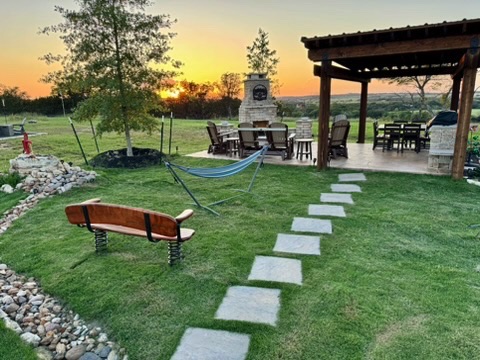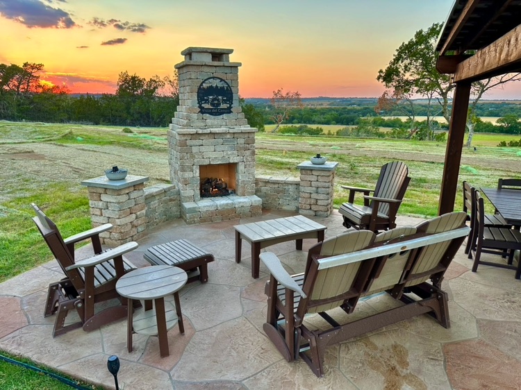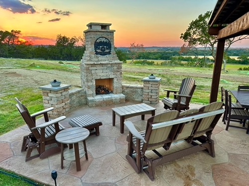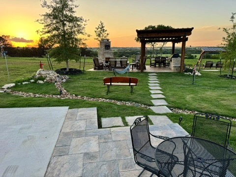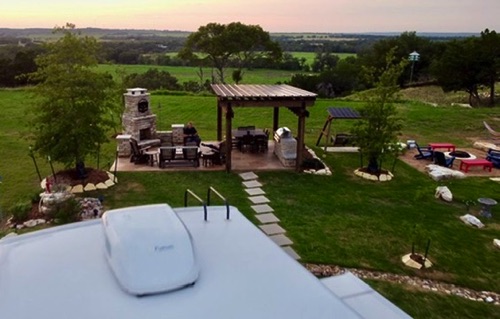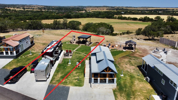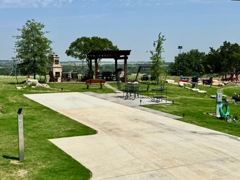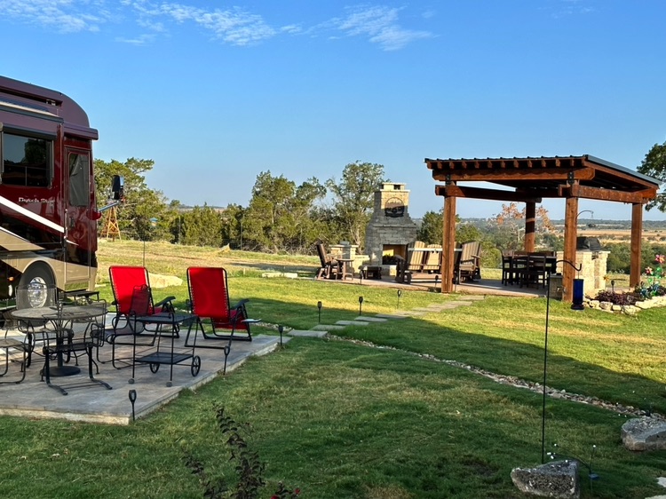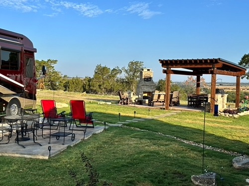 Our site 78 is an executive level site offering full amenities where class-A RVs are able to park nose in to enjoy a huge front windshield hill country view (top of the hill). Fifth Wheels and Travel Trailers are able to back in too, because we have included full hookups on both sides of the pad. This site's length was extended and provides more than 70 feet for those that have trailers or need the extra length and space. The site includes a 200 square foot professional concrete paver pad to the side, right next to the RV pad where with tables and chairs. A short walk through the yard to the rear of the site you will find another 400 square foot patio with a full size, stone wood burning fireplace for ambience and warmth. High quality rocker furniture to seat 6 people, along with a large dining table and chairs to seat 8 people during meal times or games and such. A professional size gas grill is also included on the pad for cooking out and entertaining. The patio includes partial covering to protect from sun and rain, which the fireplace area is open air to enjoy the stars at night. The is an amazing, unobstructed hill top view of the Texas Hill Country looking to the rear of the property. You can see for miles and the sunsets are outstanding! Three oak trees have been planted to aid with shade and there is a water feature too. This is a perimeter site so there are no other sites directly behind ... rather a clear view of the Texas Hill Country. This is also the ONLY RV site in this very special hill top section of the resort.